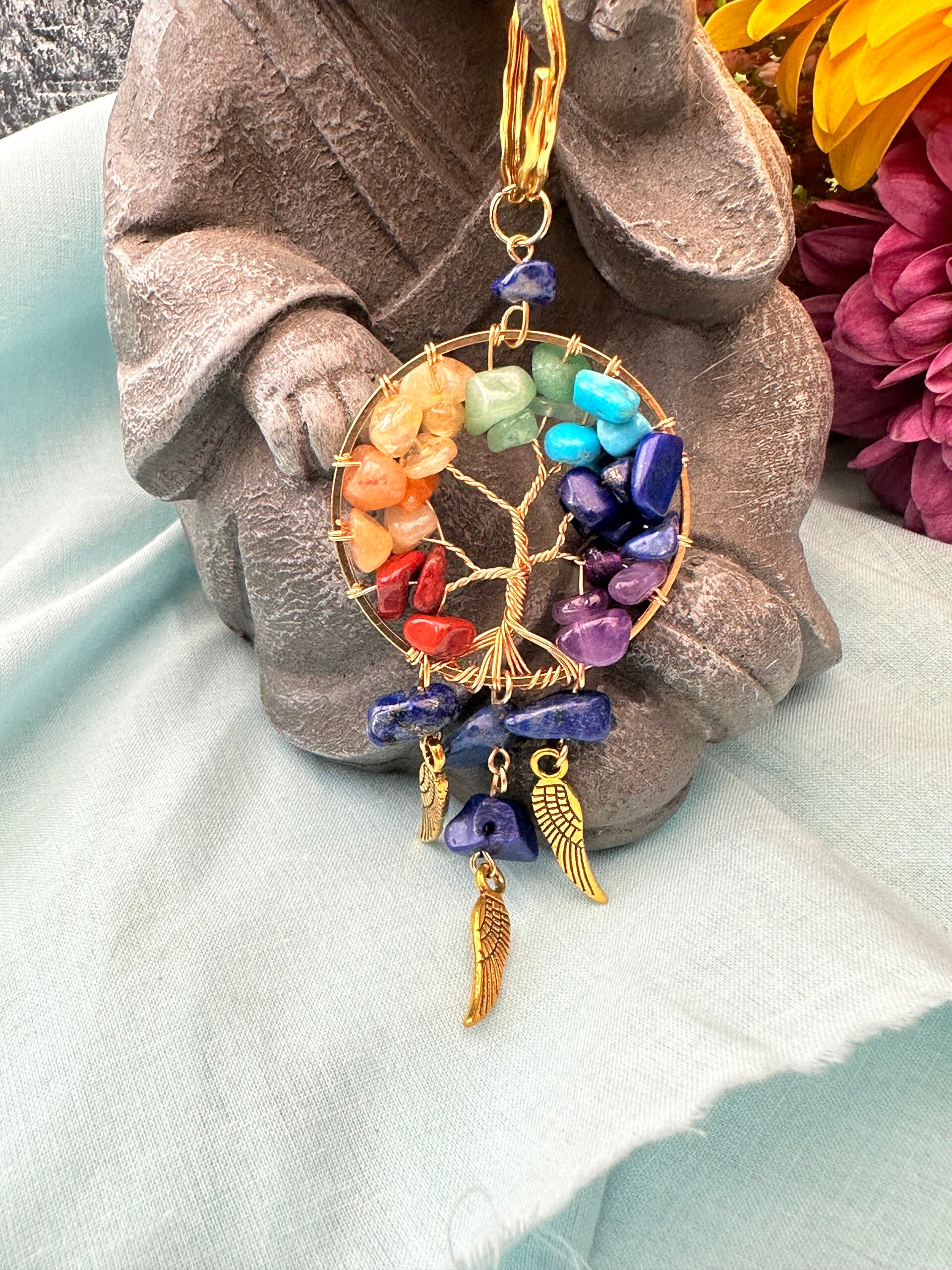 Een chakra sleutelhanger in het goud met sodaliet edelstenen.