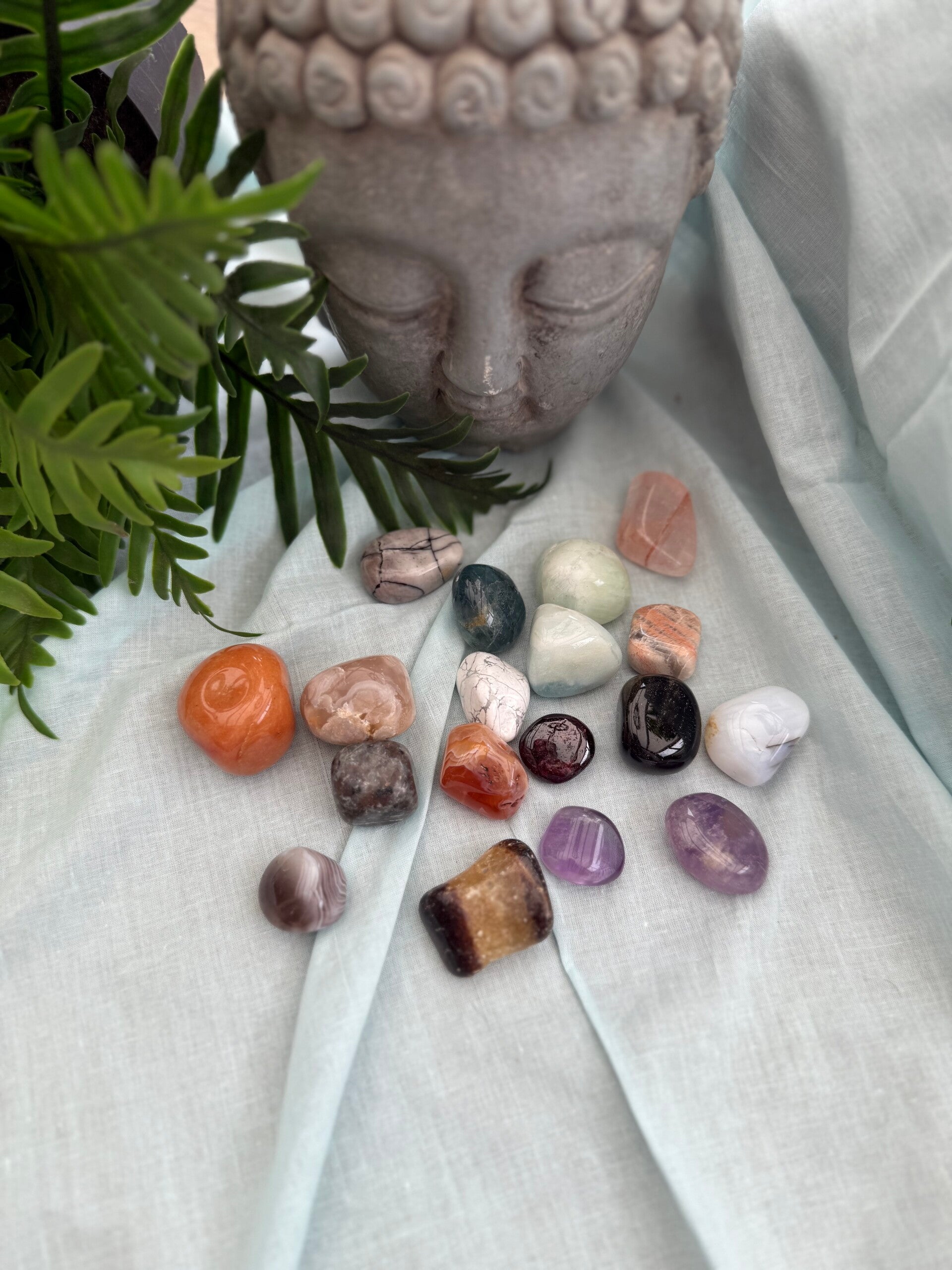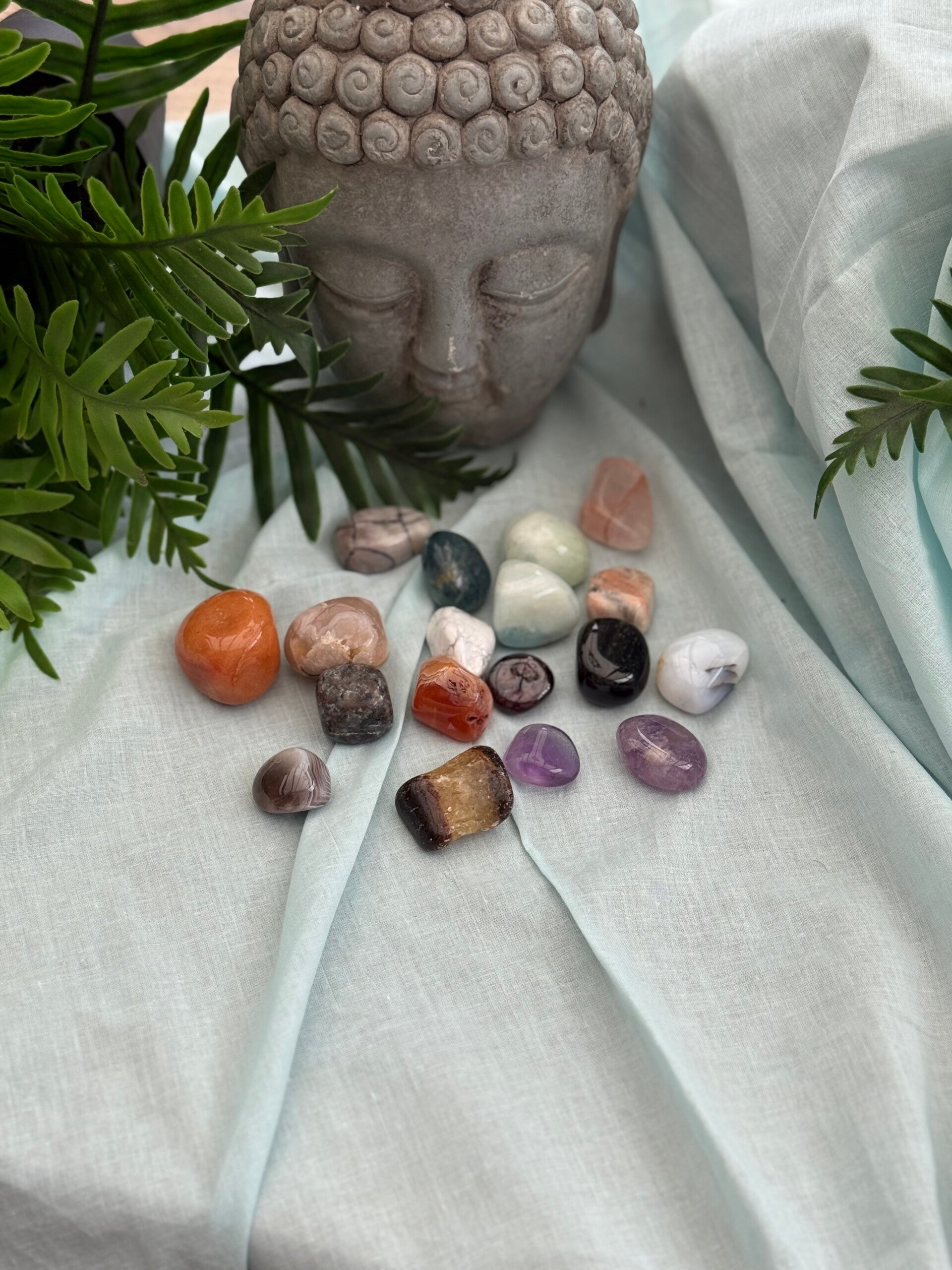 Een kleurrijke set van verschillende trommelstenen, elk met hun eigen unieke energie en werking. Perfect om te gebruiken voor meditatie, healing, als decoratie of om mee te dragen in je zak of tas.