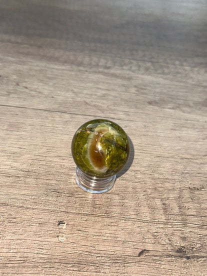 Een prachtige serpentijn bol met diepe groene tinten en natuurlijke patronen. Serpentijn staat bekend als een beschermende en aardende steen, die helpt om rust en balans te vinden in het dagelijks leven.